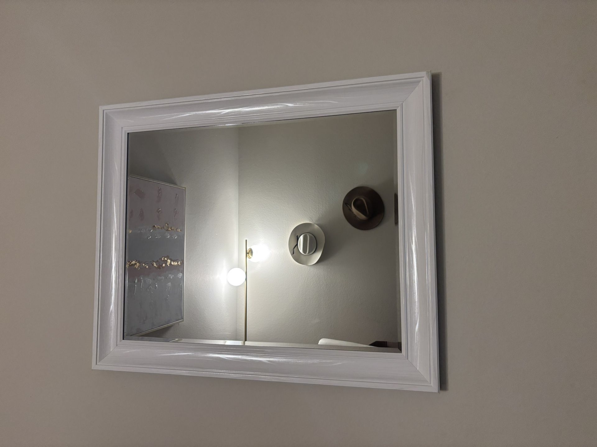 Large mirror with white, wood trim.