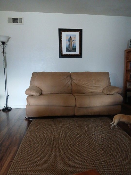 Brown cloth couch. In excellent condition. Covered to protect fabric. Probably used as a bed only 10 times.