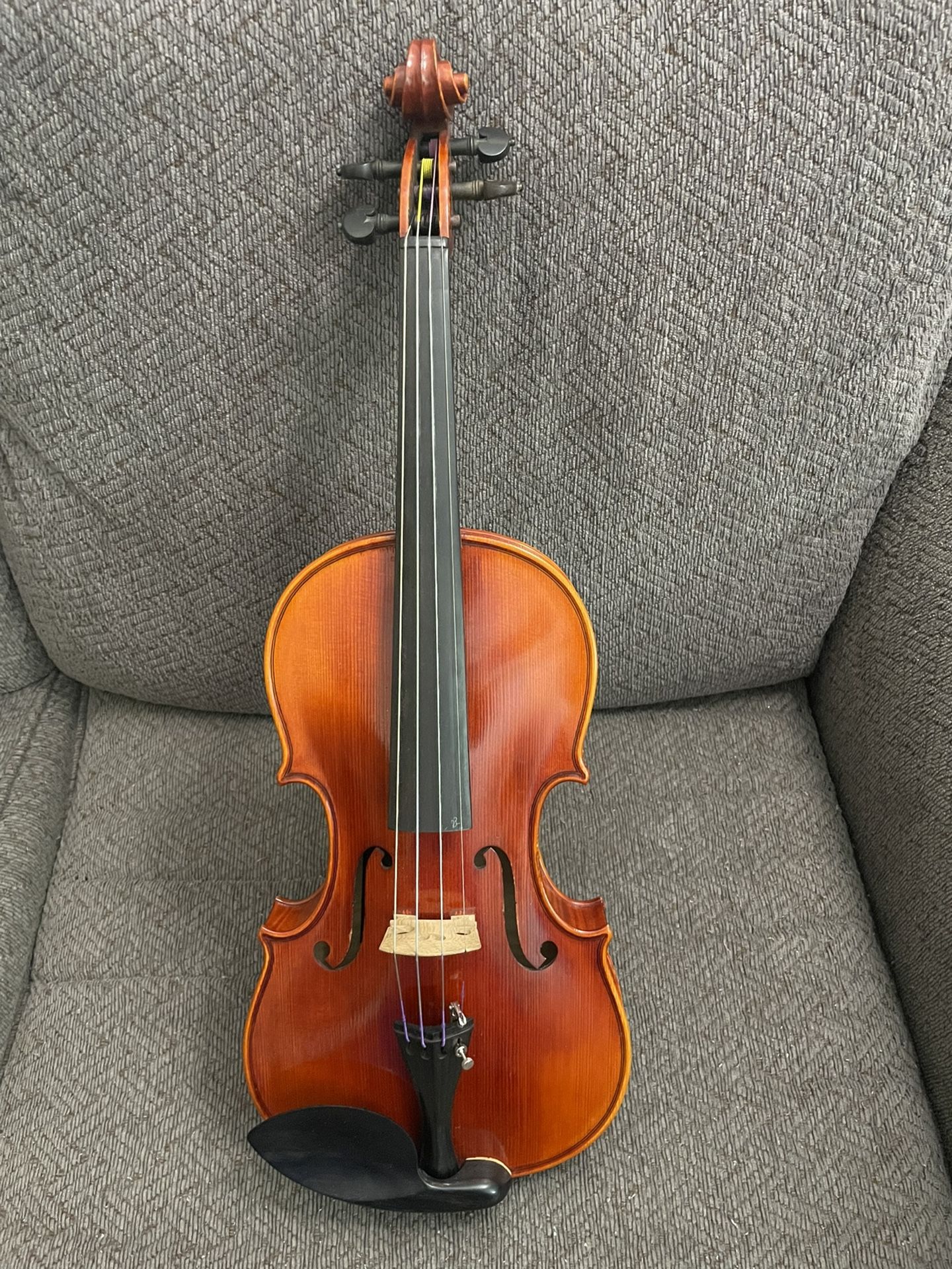 Haiqu brand violin made by Violin House of Jian Hua. Beautiful stripe pattern on back with silky smooth sound. Tuned and ready to play. Price includes violin, bow and case.