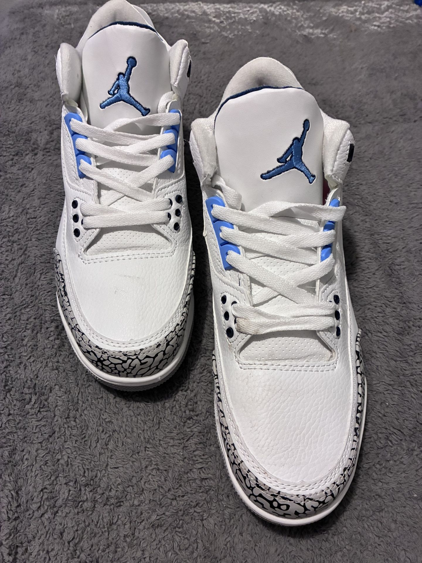 Selling a pair of Air Jordan 3 “UNC” (White/Valor Blue‑Tech Grey), style code CT8532‑104, size 13 men’s. Shoes are brand new, never worn outside, but I no longer have the original box, so pricing below StockX/GOAT. Tumbled white leather upper with elephant print on toe/heel and UNC blue Jumpman on the tongue and eyelets. Local pickup in Nogales/Tucson area only, cash or Zelle; meet in a public place. No trades, lowball offers ignored.