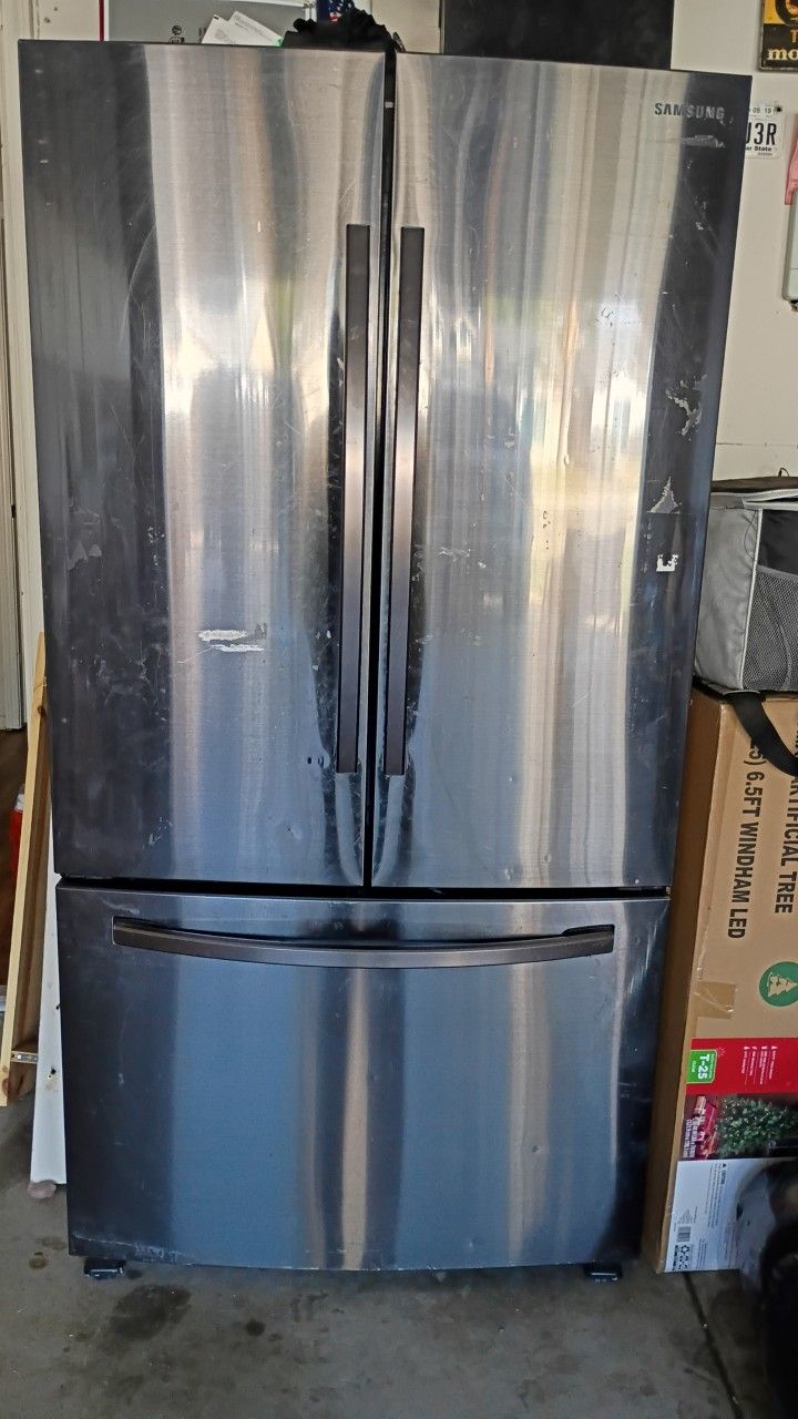 28 cu. ft. Large Capacity 3-Door French Door Refrigerator with AutoFill Water Pitcher in Black Stainless Steel Missing drawer and a few door shelf's. Sold as is. Must pick up.