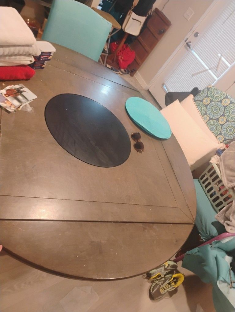 This is a beautiful table where the ends can pull out to make it a round table their storage at the bottom it has a marble lazy Susan in the middle purchased off Wayfair for about $1,100 a few years ago. Still in amazing condition.