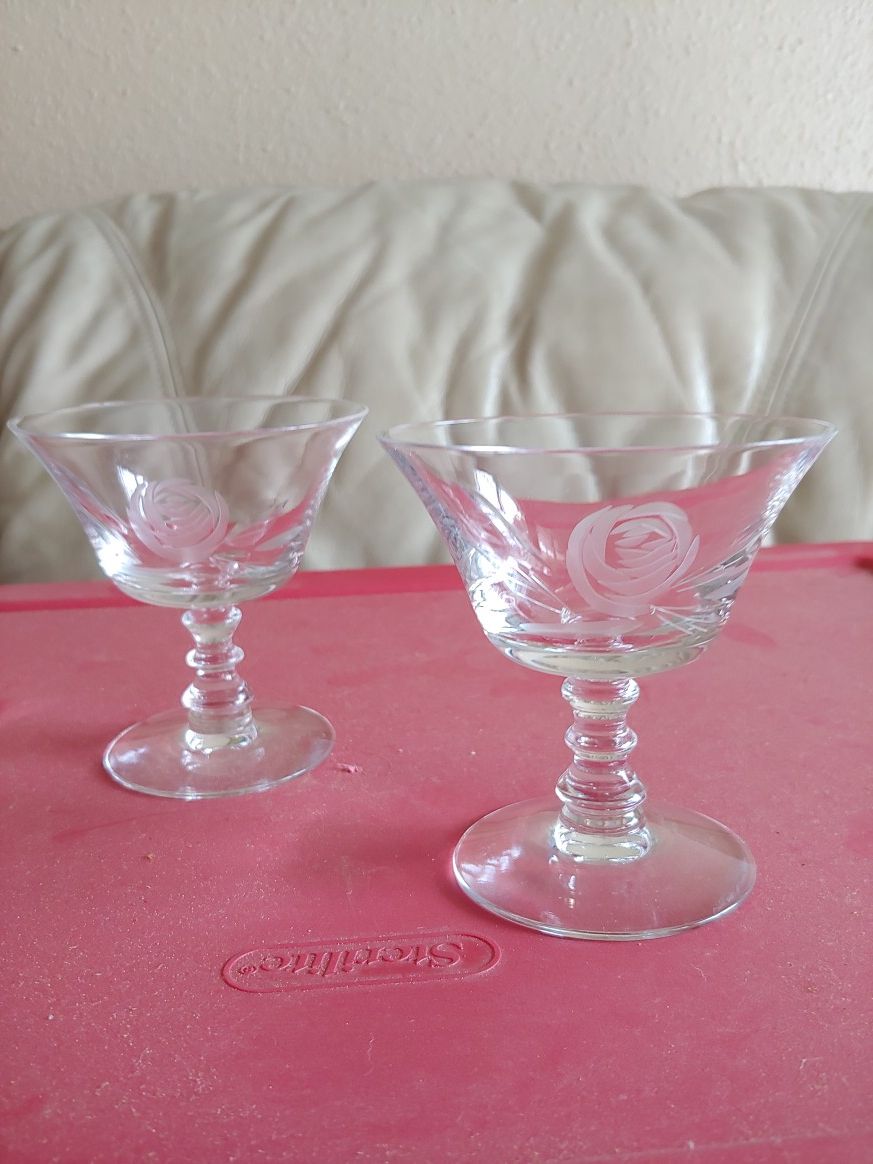 Two antique depression glass etched crystal dessert,wine ,champagne or water glasses! Se habla español!
