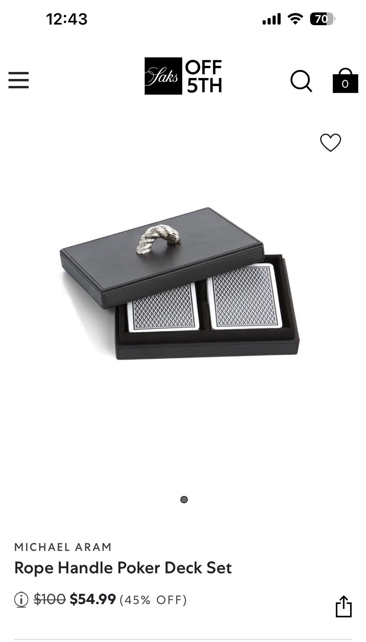 The Michael Aram poker deck set includes two decks of cards presented in an elegant leather case with a rope-inspired handle Perfect for accessorizing the bar or bringing a touch of style to a poker game Includes: 2 decks of playing cards 4"W X 6"L X 2"H Leather/nickelplate/ultrasuede Spot clean with a damp cloth