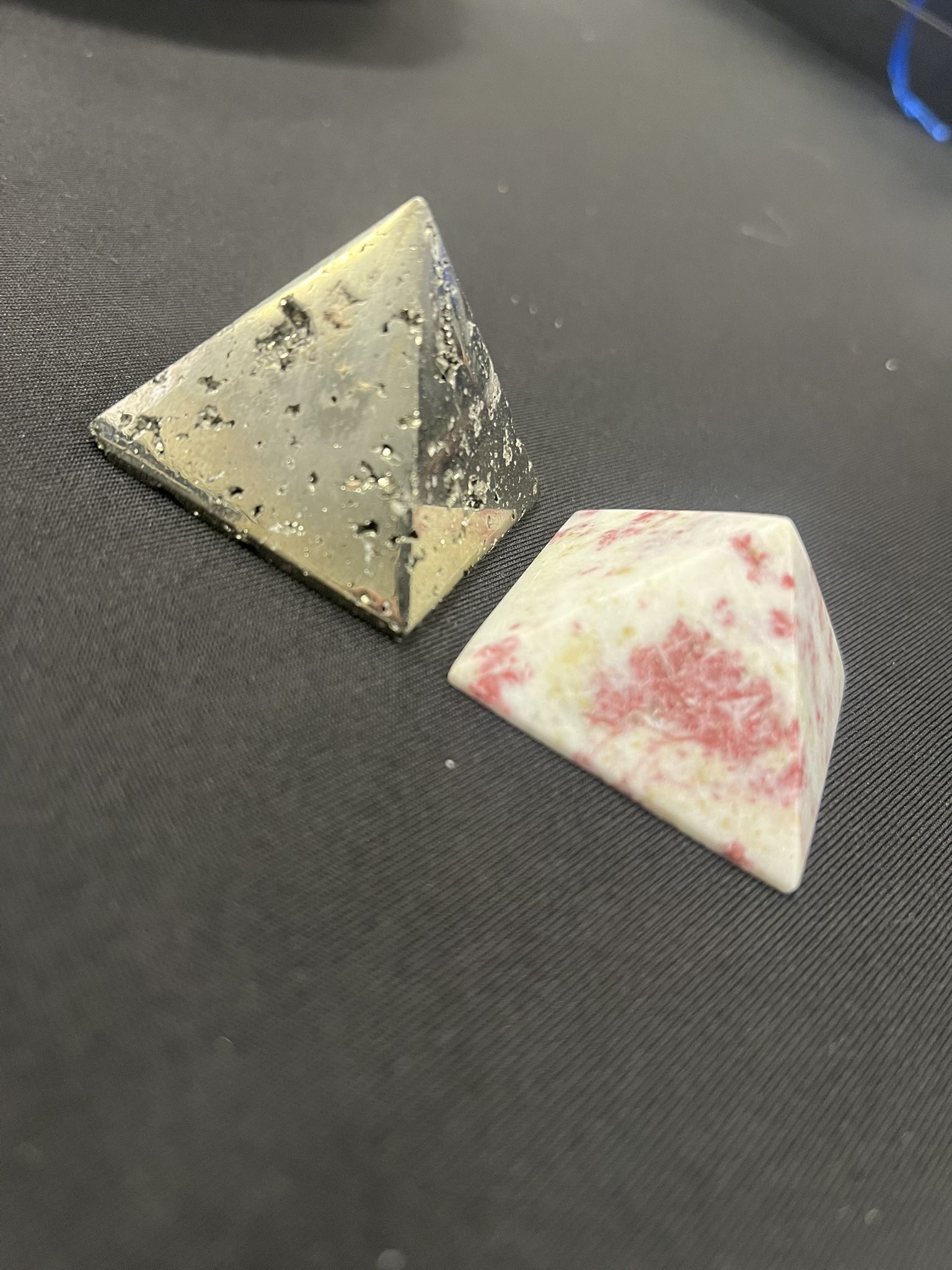 One pyrite and one Cinabrite pyramid. Pyrite is iron and sulphur (Fe). It also called fools gold by many because of its shine and color. Cinabrite is a mixture of pink Thulite and white Scapolite from Peru.
