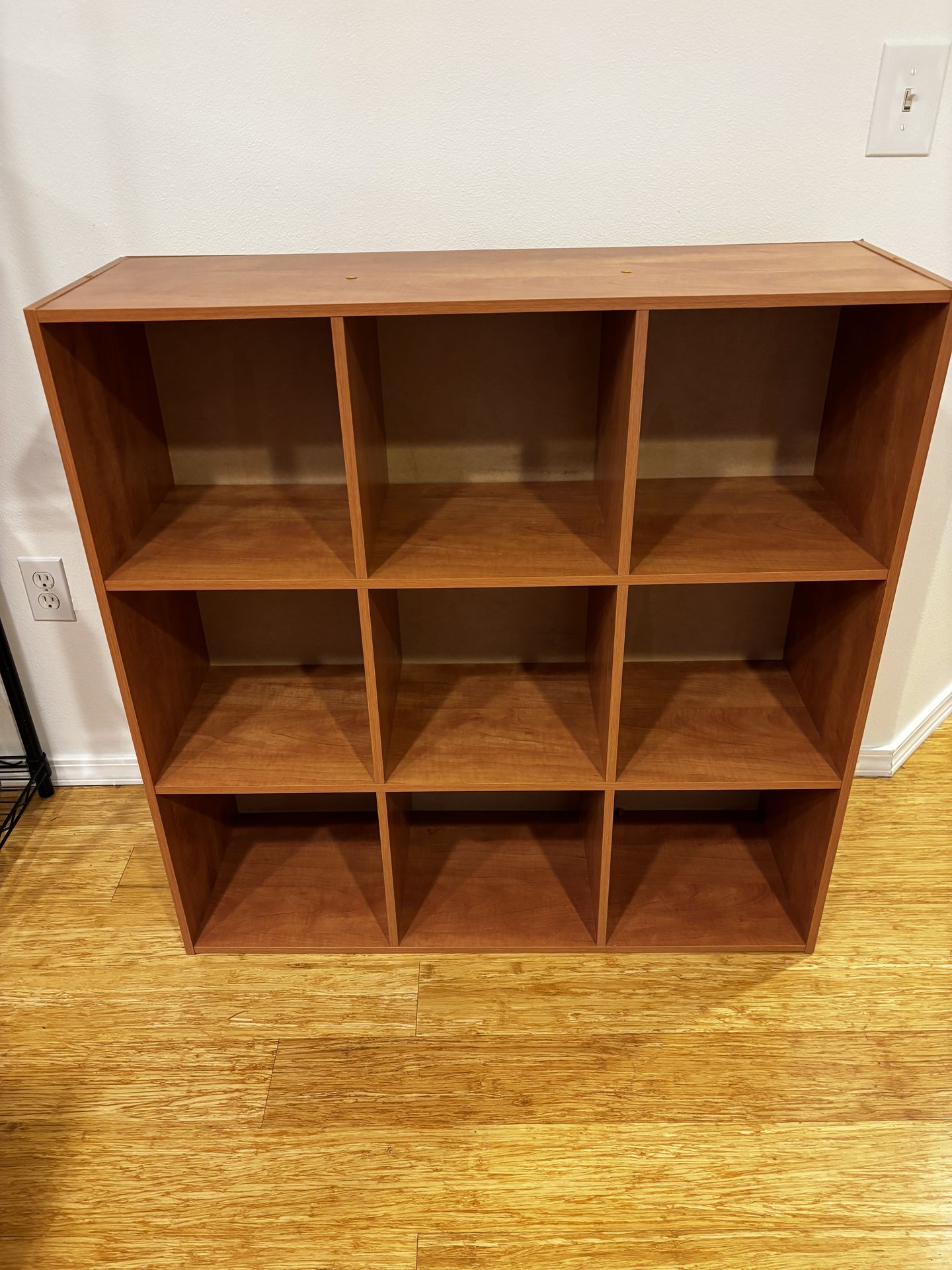 Brown storage shelves, 3 x 3 cubes. Each cube is 11.25” x 11.25”. TWO are available- $20 for one or both for $30. One has a small deformity as shown.