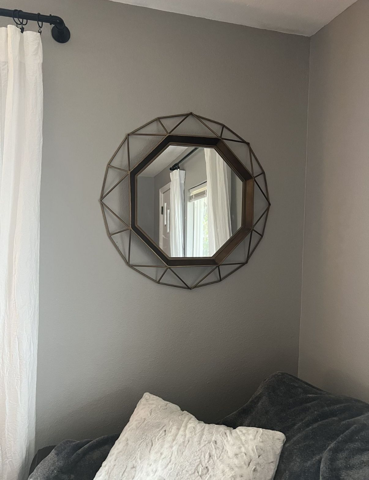 Adorable gold geometric mirror, in great condition. Easy to hang, fairly light weight! About 30x30. Lots of cute things listed, check them out π