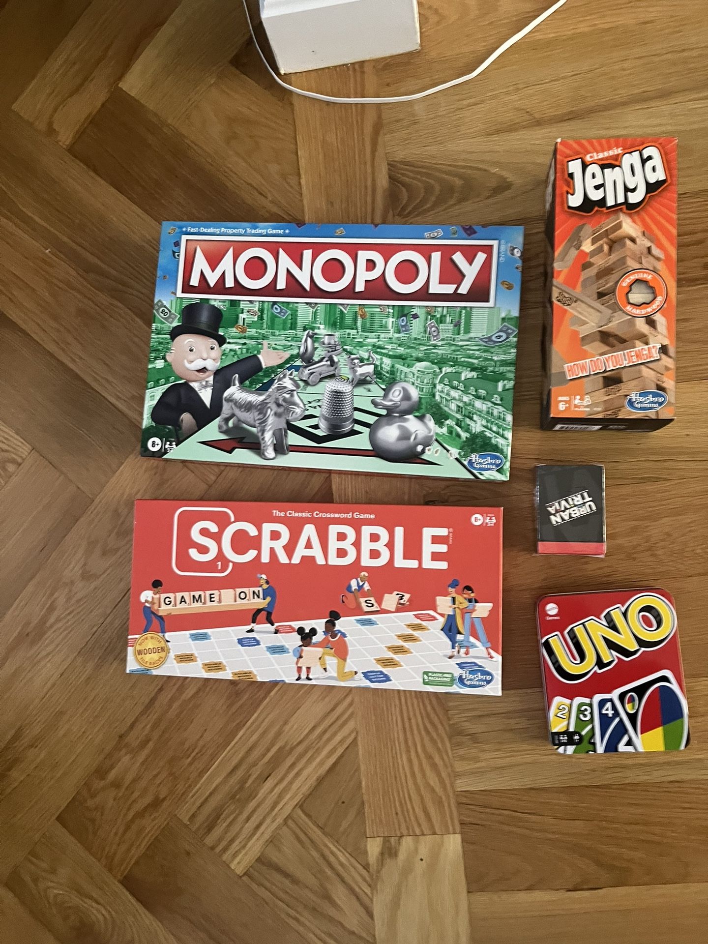 Bundle of brand new unopened unused games: Monopoly Scrabble Jenga Urban Trivia Uno
