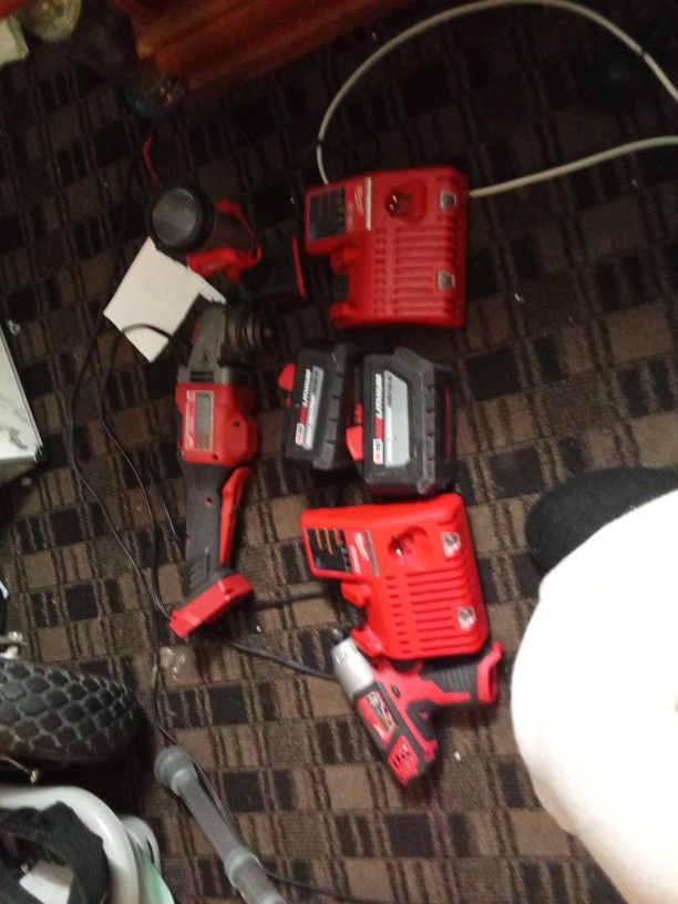 Milwaukee Grinder , Flashlight And Impact 2 Batteries And Two Chargers