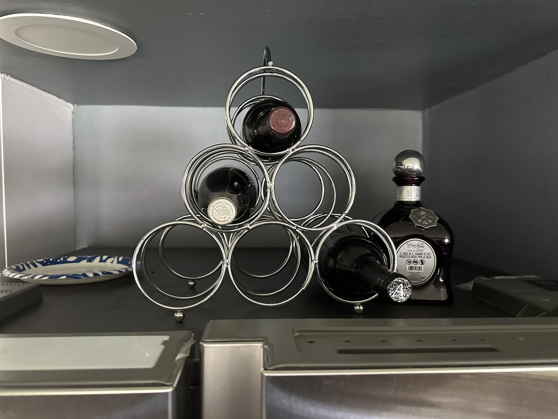 Classic silver table top wine rack in excellent shape. Holds five regular size bottles.