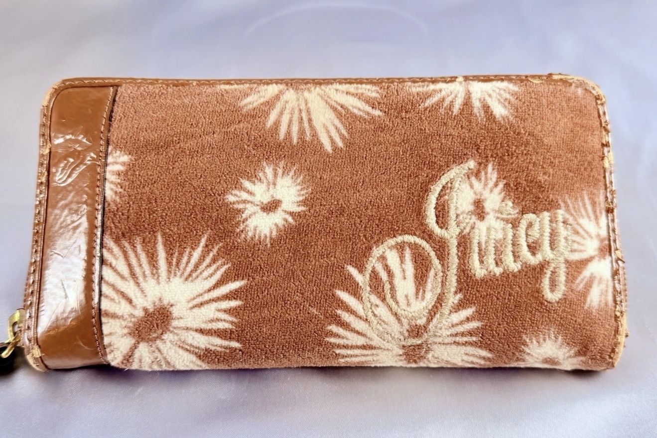 RARE VTG Juicy Couture Wallet Y2K Coffee Velour White Sunburst Flower Zip Around