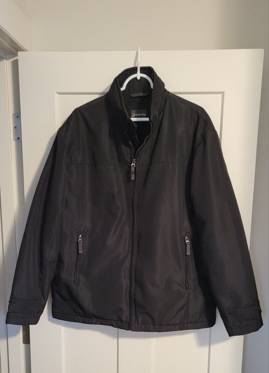 St. John's Bay Men's jacket in black with hidden collar hood with velcro. This jacket features two side zipper pockets, three extra pockets on the inside of the jacket and adjustable cuffs. The inside is lined with mesh and fleece. From a smoke and pet free home.