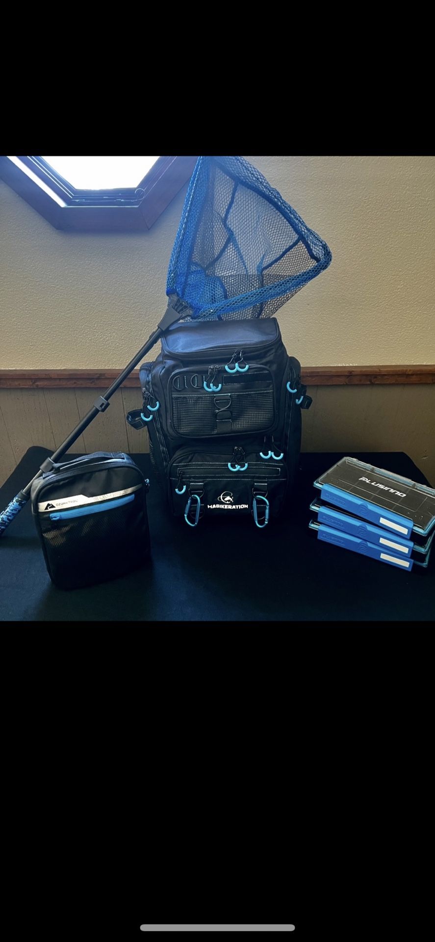 Full Size Tackle bag Back Pack/ Day Bag With 3600 size Tackle Boxes, Bait Binder, Fishing Net.