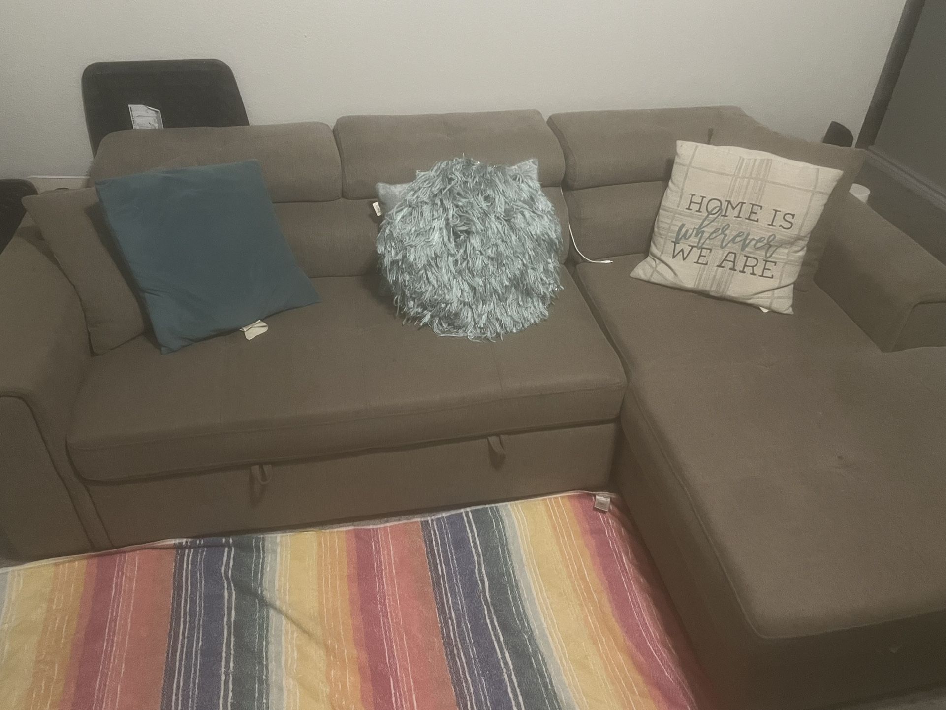 Brown L couch from Rooms To Go, has a storage, pull out bed & working wireless charger attached with a cup holder. No damage at all. $800 OR BEST OFFER