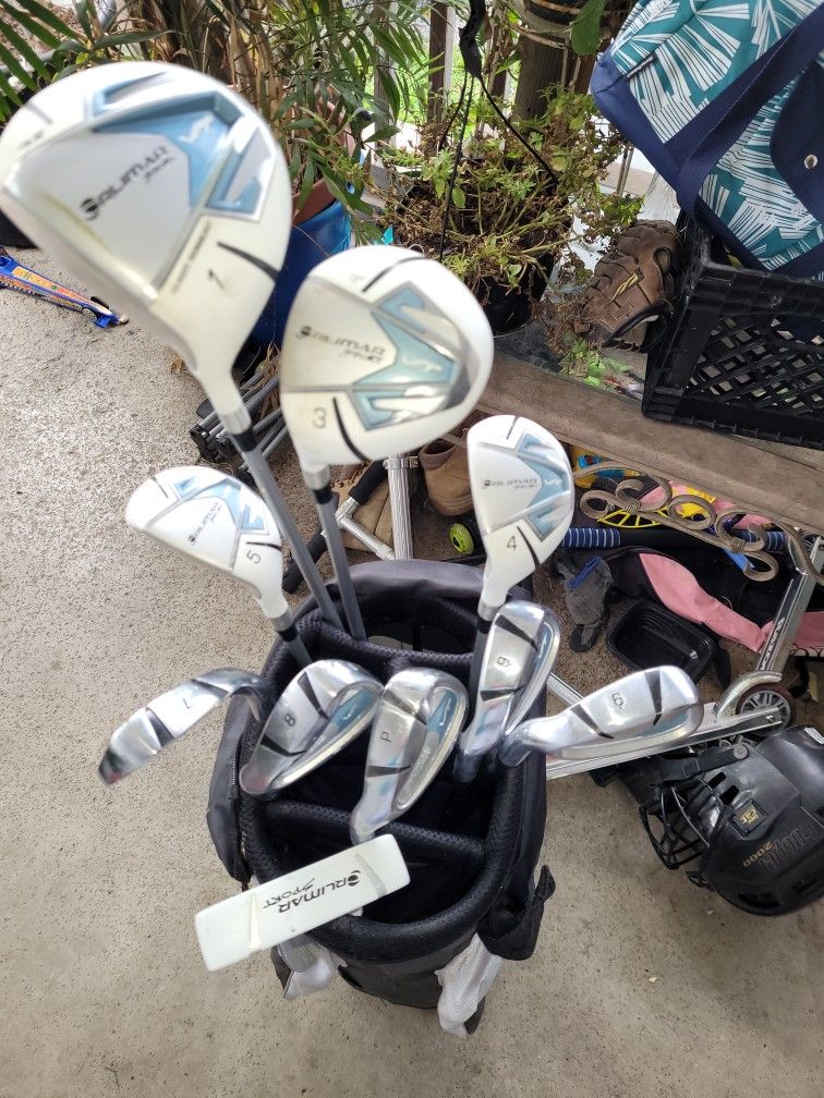 Womans Rlimar sport vt left handed club set. Pw, 9,8,7,6 irons, putter, 1, Driver, 3,4,5 woods, and bag. Bag isn't the greatest needs cleaned.
