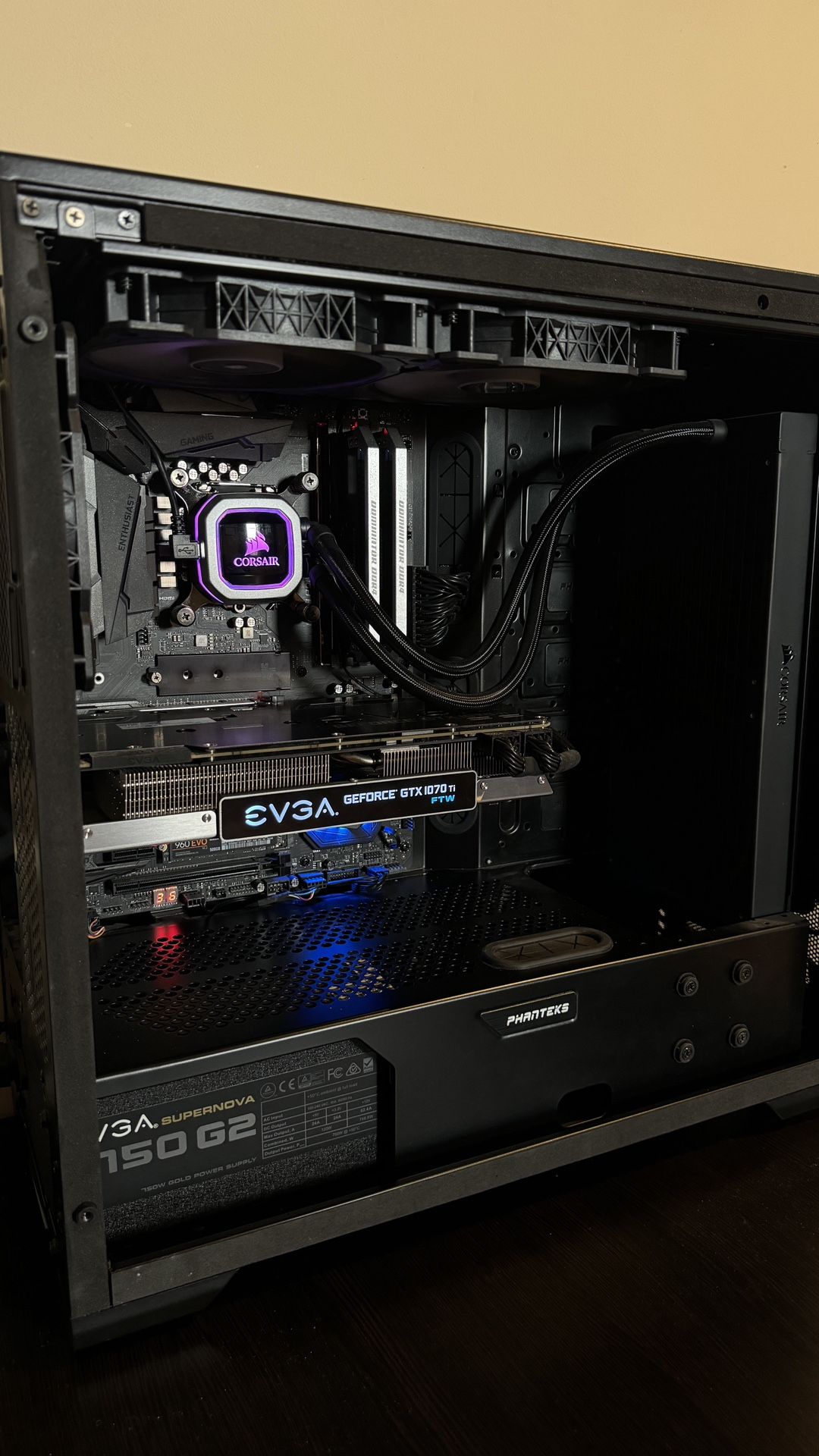 Hello. I have a PC for sale that I built in 2018. It has the following components that I bought new: CPU: Intel 8700k Cooler: Corsair Hydro H115I AIO cooler Motherboard: MSI Z370 Gaming M5 GPU: EVGA GTX 1070 TI RAM: Corsair Dominator 16GB 3200mhz PSU: EVGA 750W G2 Fully Modular Storage 1: Samsung 960 EVO 500GB M.2 NVMe Storage 2: Samsung 850 EVO 250GB SSD Case: Phanteks Enthoo Pro Tempered Glass Case Misc: Corsair ML140 PWM fans x5 Silverstone 8-Port Fan Controller I also just reapplied a new coat of Arctic MX-4 thermal paste a few days ago. It DOES NOT come with any accessories, just the PSU power cable and HDMI cable to plug into the screen. I can also provide a video of the PC running. No trades