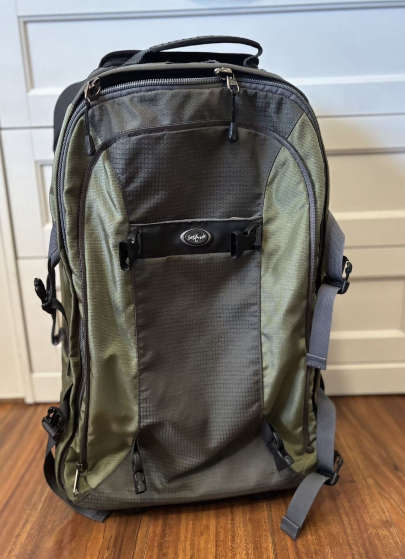 Eagle Creek Switchback International Carry-On rolling backpack in green/grey.