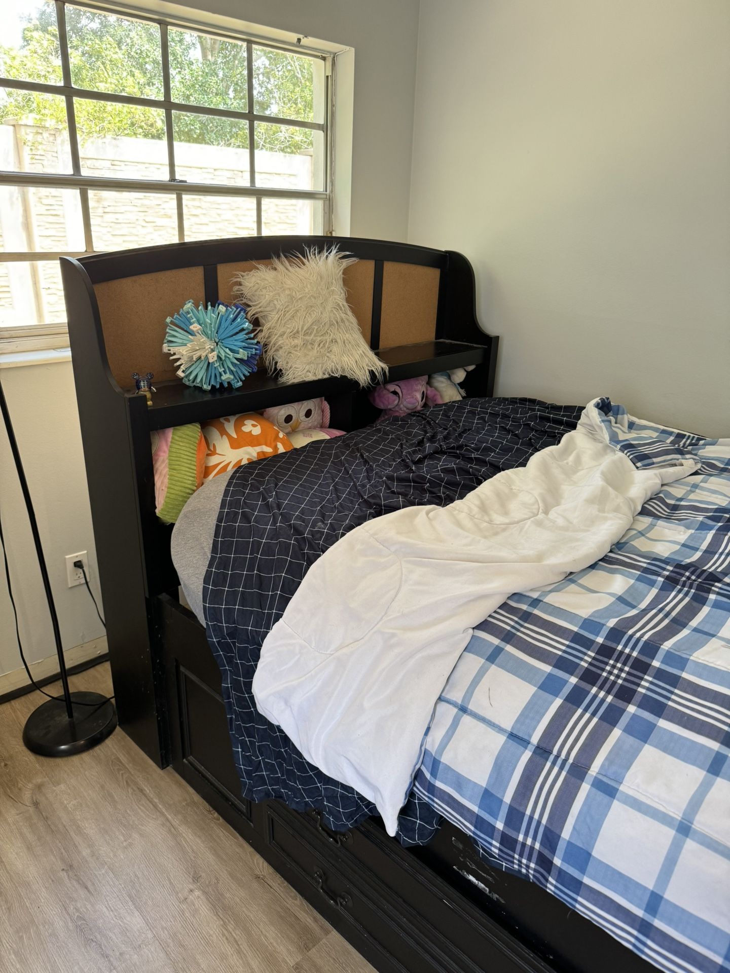 Full size, black frame with 2 large drawers on the bottom. One metal handle missing, can easily be reinstalled. Small cork board in the upper back for pictures, etc. Mattress included. Price negotiable.