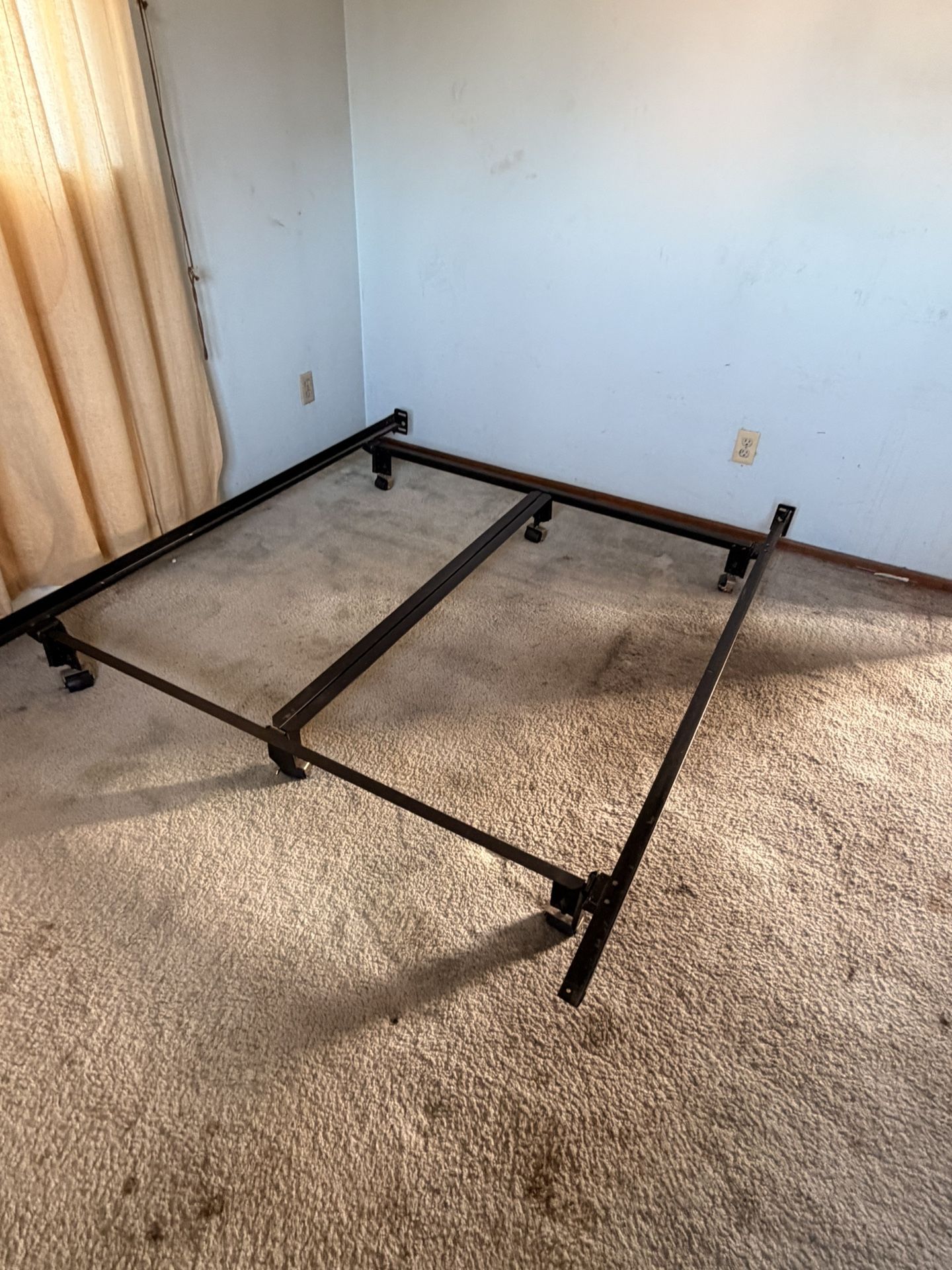 Bed frame for likely queen size mattress. Dimensions are in photos. Asking $50 cash only please.