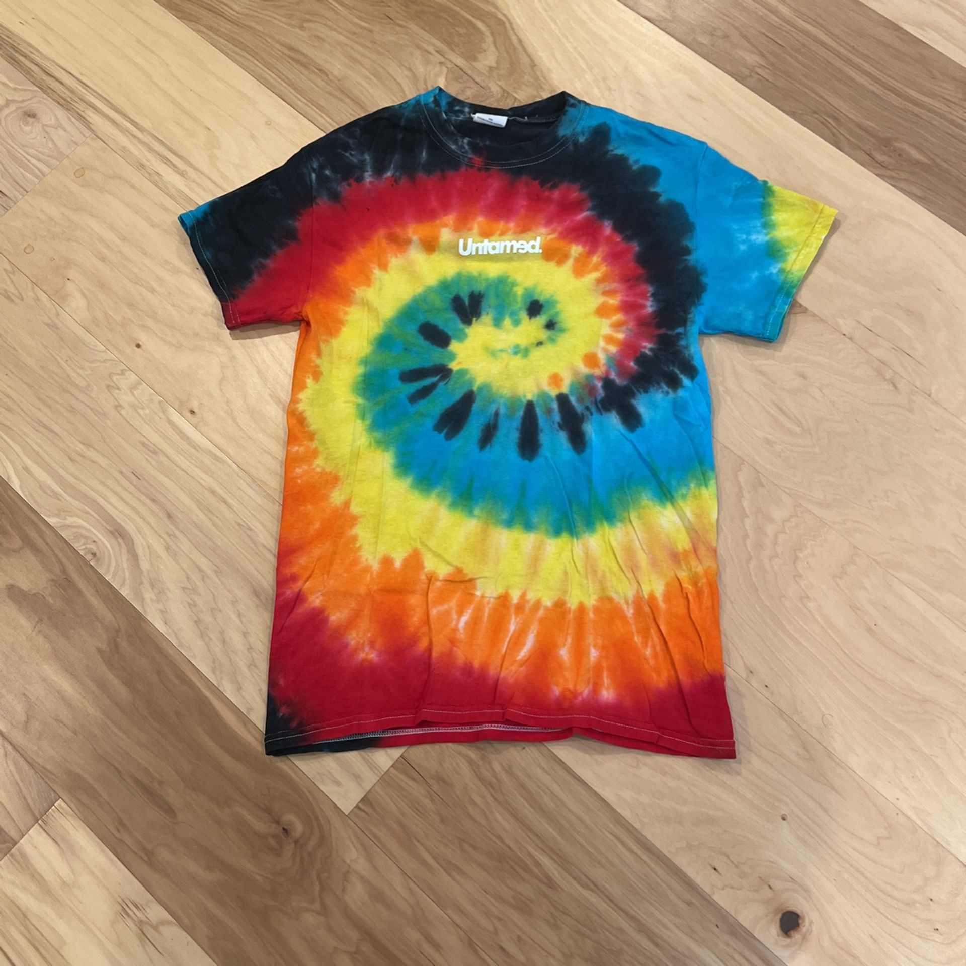 Tie-dye T-shirt by untamed. Visit colors, red orange, yellow blue green black.
