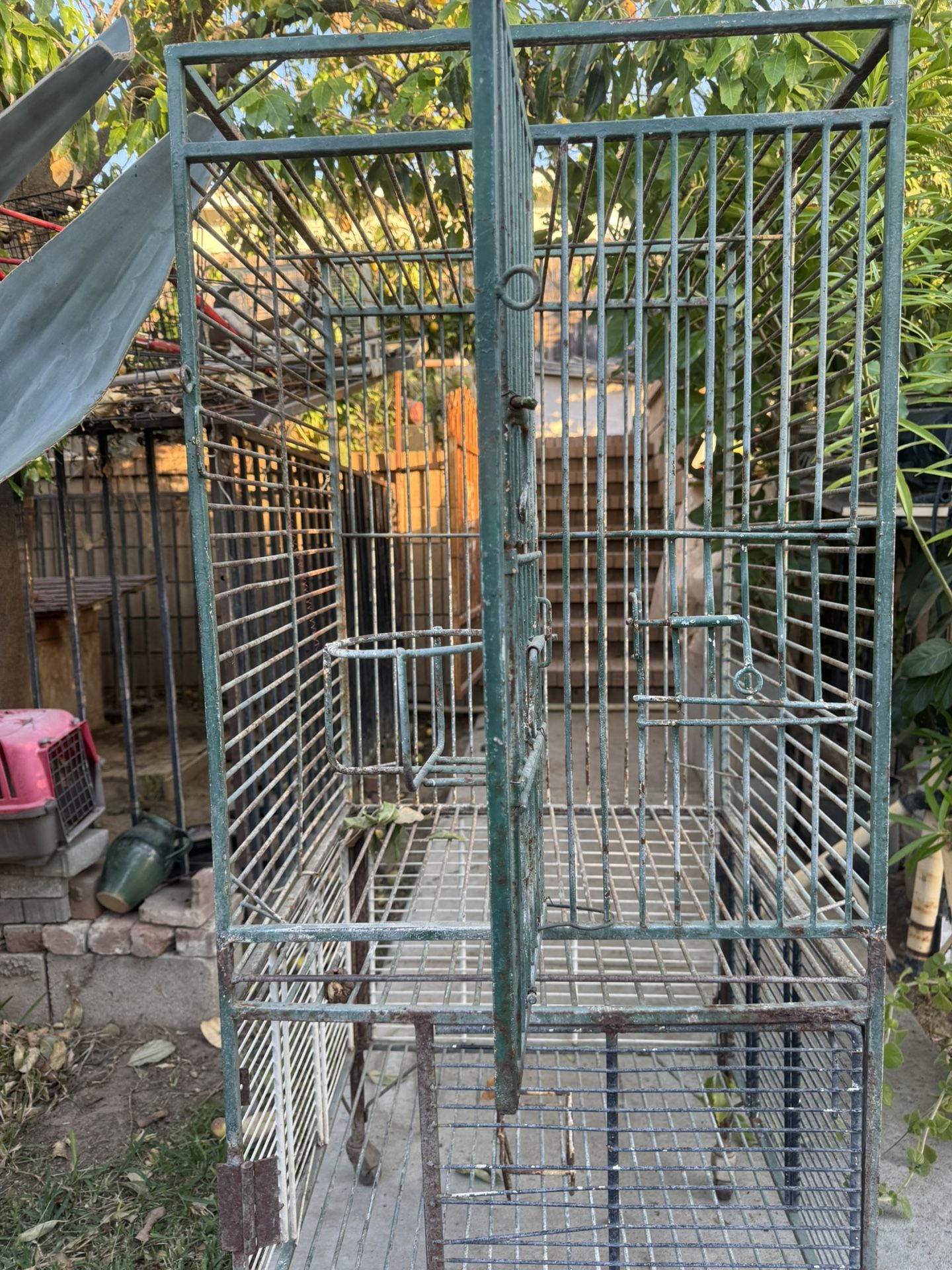 Large metal birdcage, sturdy and spacious, perfect for small to medium-sized birds. Includes built-in feeder sections and perches. Some wear and rust, but still functional and durable. Great for pets or as a restoration project. Open to offers & must pick up (as is)
