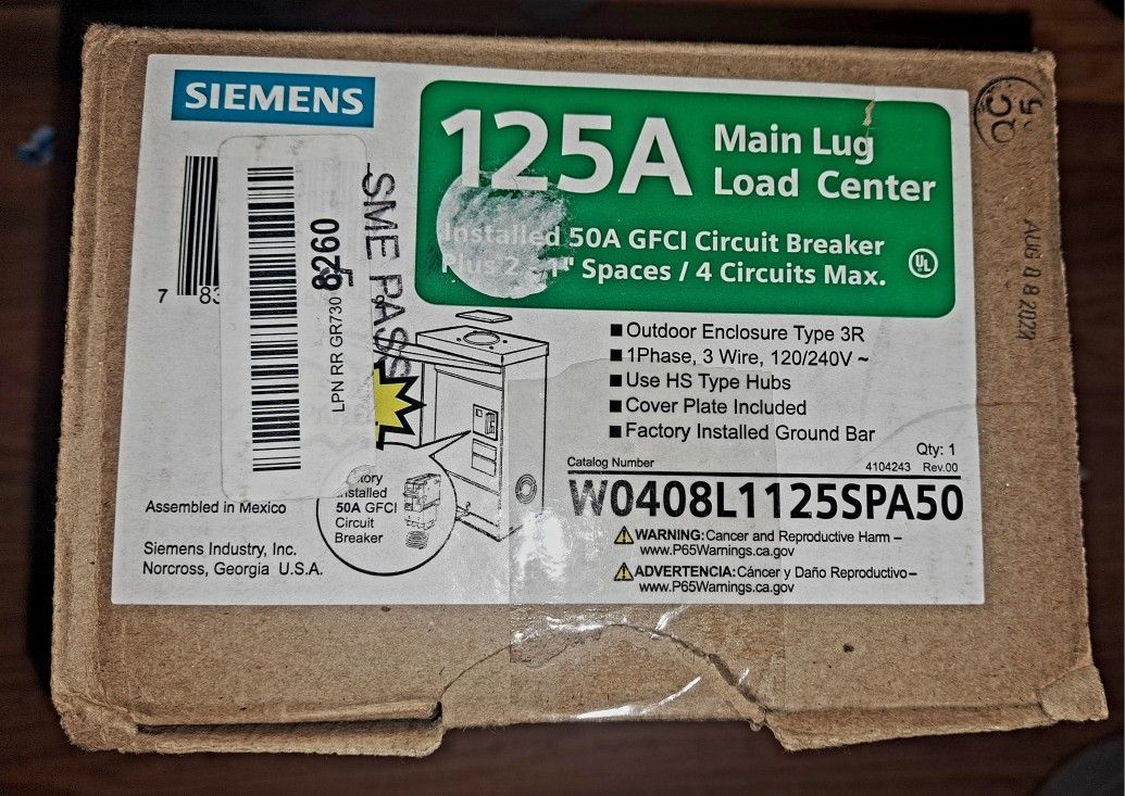 Siemens 125 Amp Main lug Load Center. 50 Amp GFCI CIRCUIT BREAKER. #W0408L1125SPA50. NEW- OPEN BOX.