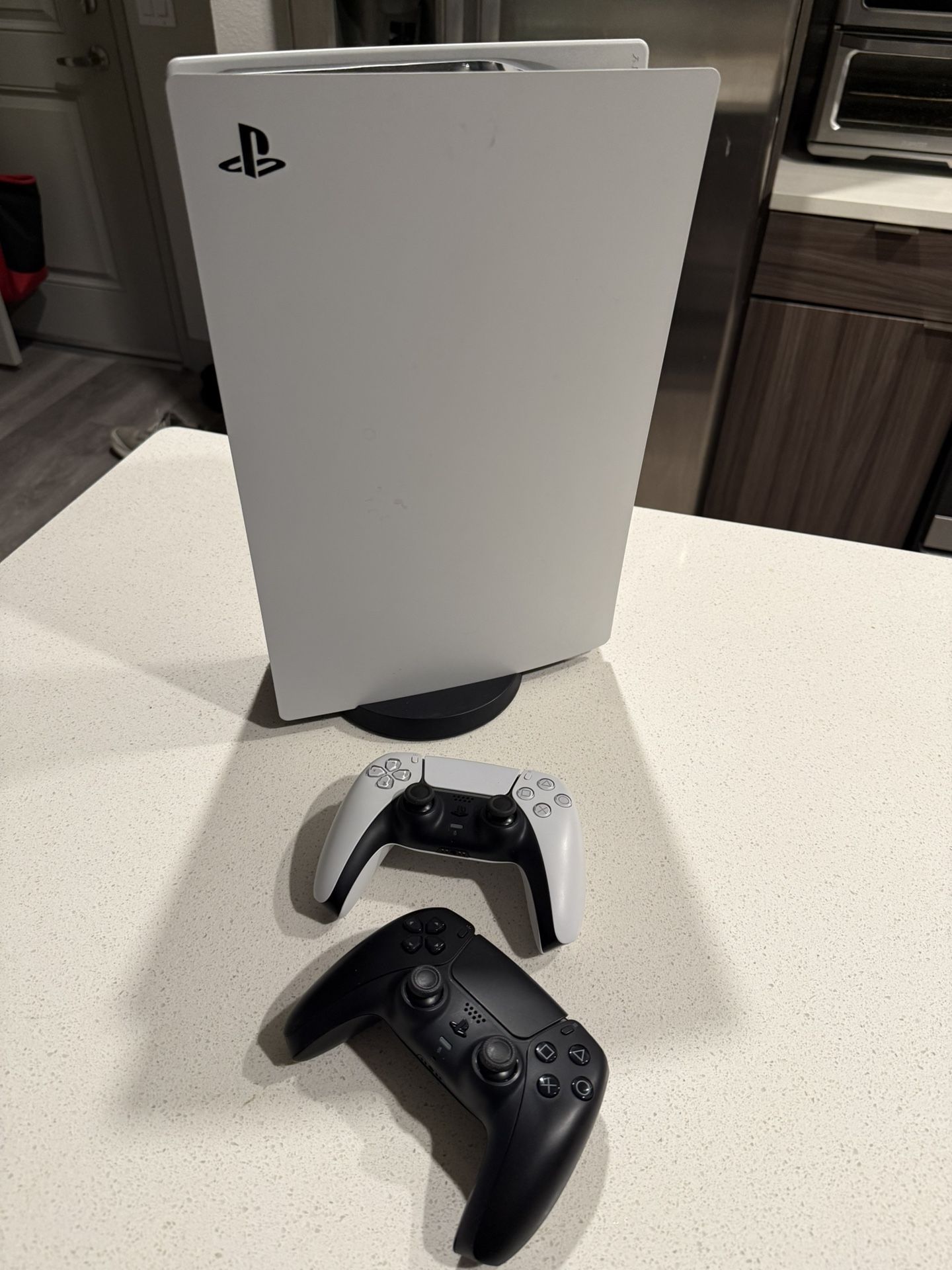 Digital PS5 with 2 remote controllers. Willing to sell things individually. Console also have a 2TB SSD inside. Power cable not included