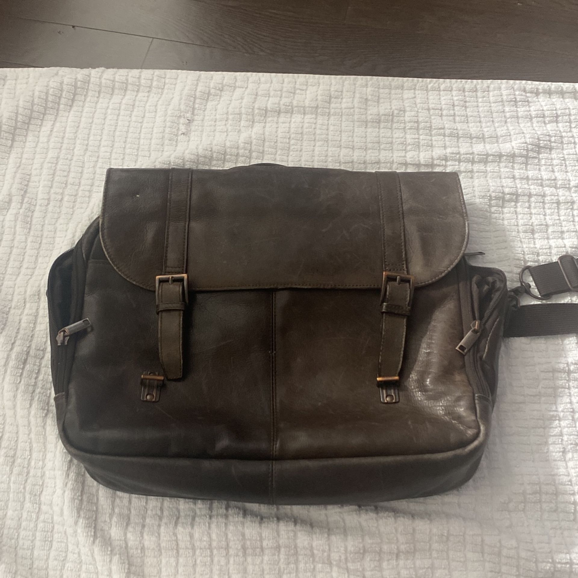 Wilson’s leather messenger bag. There is one piece that is somewhat tattered. It works great. I just prefer a backpack.
