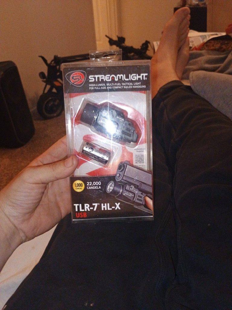 Streamlight TLR-7 HL-X Handgun Weapon Light - The TLR-7 HL-X USB high-lumen, multi-fuel, rail-mounted light is engineered to produce a longer reaching, tighter beam. It accepts either Streamlight’s SL-B9 USB-C rechargeable protected lithium-ion battery pack or a single CR123A lithium battery. Interchangeable rear paddle switches accommodate your shooting style. Engineered to produce a longer reaching, tighter beam; 1,000 lumens, 22,000 candela Front-loading battery capability “Safe-off” feature prevents accidental activation, saves batteries Interchangeable rear paddle switches SL-B9 battery pack charges within 2.5 hours via USB-C cord or bank charger; rechargeable up to 500 cycles 6000 Series machined aircraft aluminum with black anodized finish Switch housing: Impact- and chemical-resistant engineered polymer High temperature, shock-mounted, impact-resistant BOROFLOAT glass lens IPX7 waterproof to 1m for 30 minutes Includes: Multi-fuel: Accepts (1) SL-B9 rechargeable battery pack (included) or (1) CR123A lithium battery, SL-B9 rechargeable battery pack.