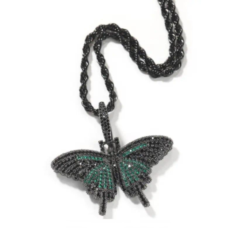 Exquisite Micro Pave Emerald Green Black Rhodium Plated A+Cubic Zirconia Butterfly Pendant With 24" Black Rope Necklace