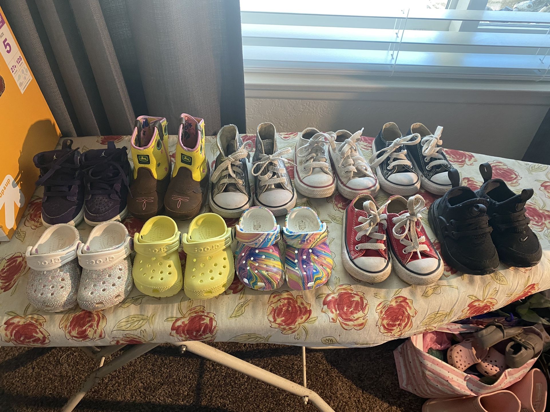 All 4c shoes Jordan Crocs Converse Nike John Deere Cowboy Boots *yellow crocs SOLD* Great condition, no holes some barley even worn. Just need a wipe down. Shoot me offers