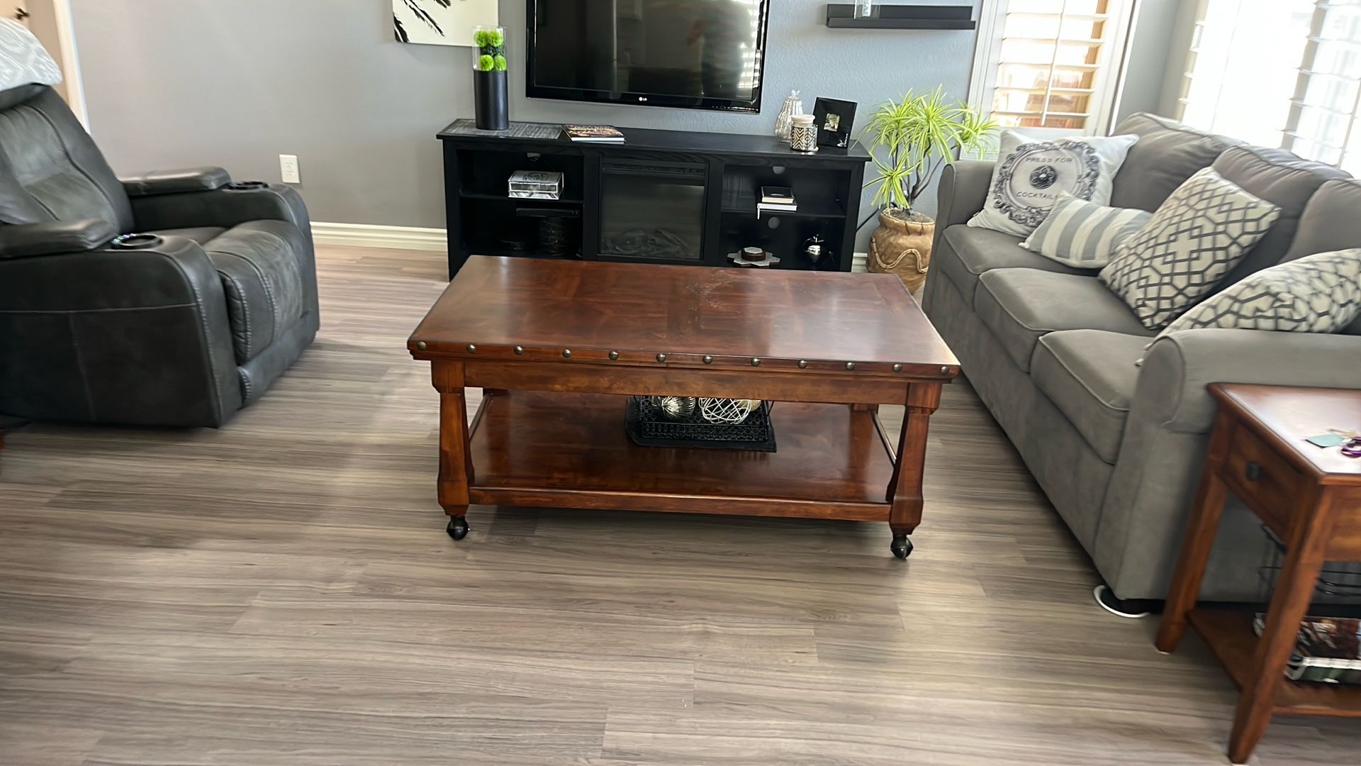 This is a nice coffee table with one matching in table has some metal accents to it and the coffee table has wheels