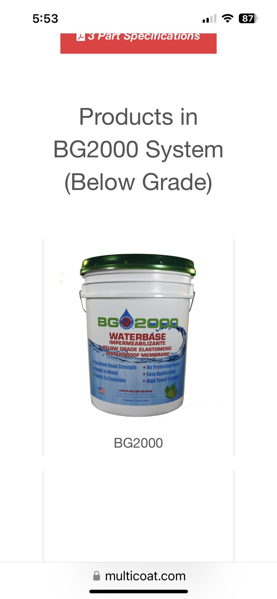 Multicoat BG2000 is a one coat spray-on, or two coat roll-on waterproofing for below grade applications, basement walls, foundation walls and planters. An acrylic water-based coating, it forms an elastomeric waterproof membrane that bonds to most materials…. Retail $270 plus tax …like $300.00
