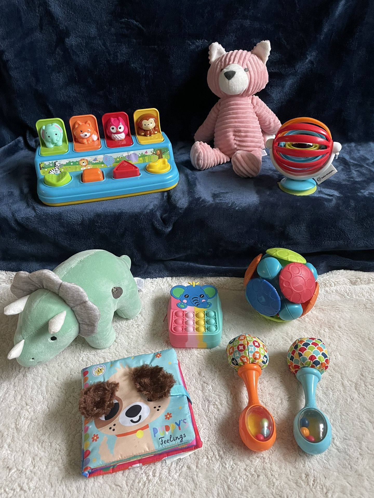Includes cause and effect toys like pop up animal toy, sensory toys, Carter’s Musical Wind up triceratops dino plush - plays soothing melodies/lullabies, etc. All work and are in excellent and like new condition. Pick up in Renton Highlands Cash preferred or Venmo only FCFS no holds
