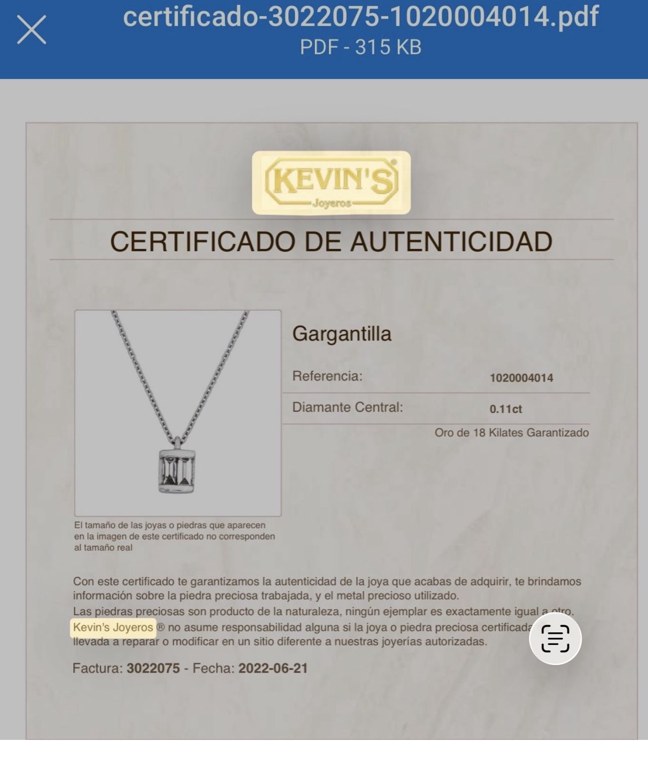 CERTIFICATE OF AUTHENTICITY Necklace Reference: Center Diamond: 10(contact info removed)4 0.11 ct 18 Karat Gold Guaranteed The size of the jewelry or stones shown in the image on this certificate does not correspond to the actual size.