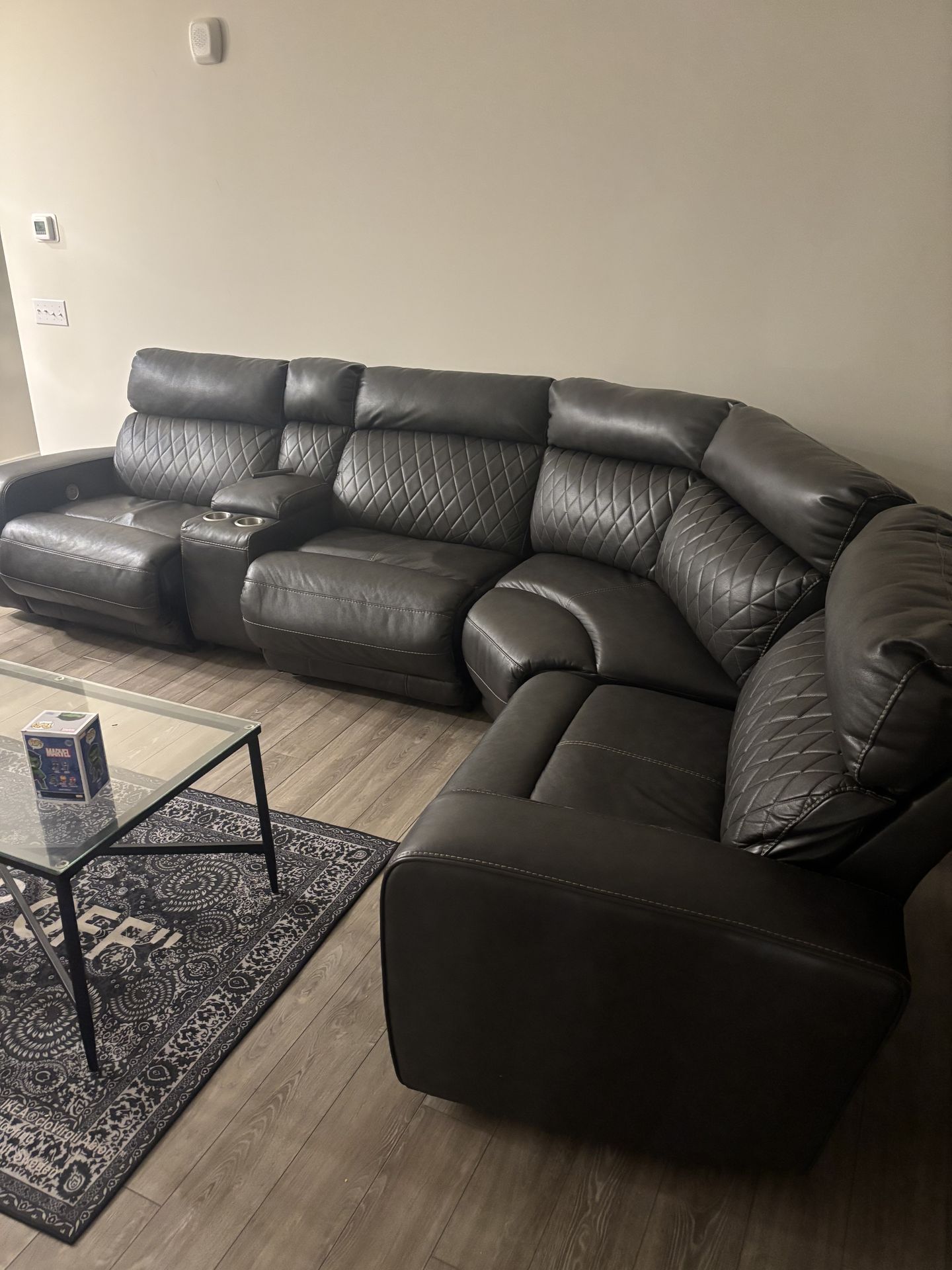 Sits about 6 people and has electrical recliners with an extra recliner not posted