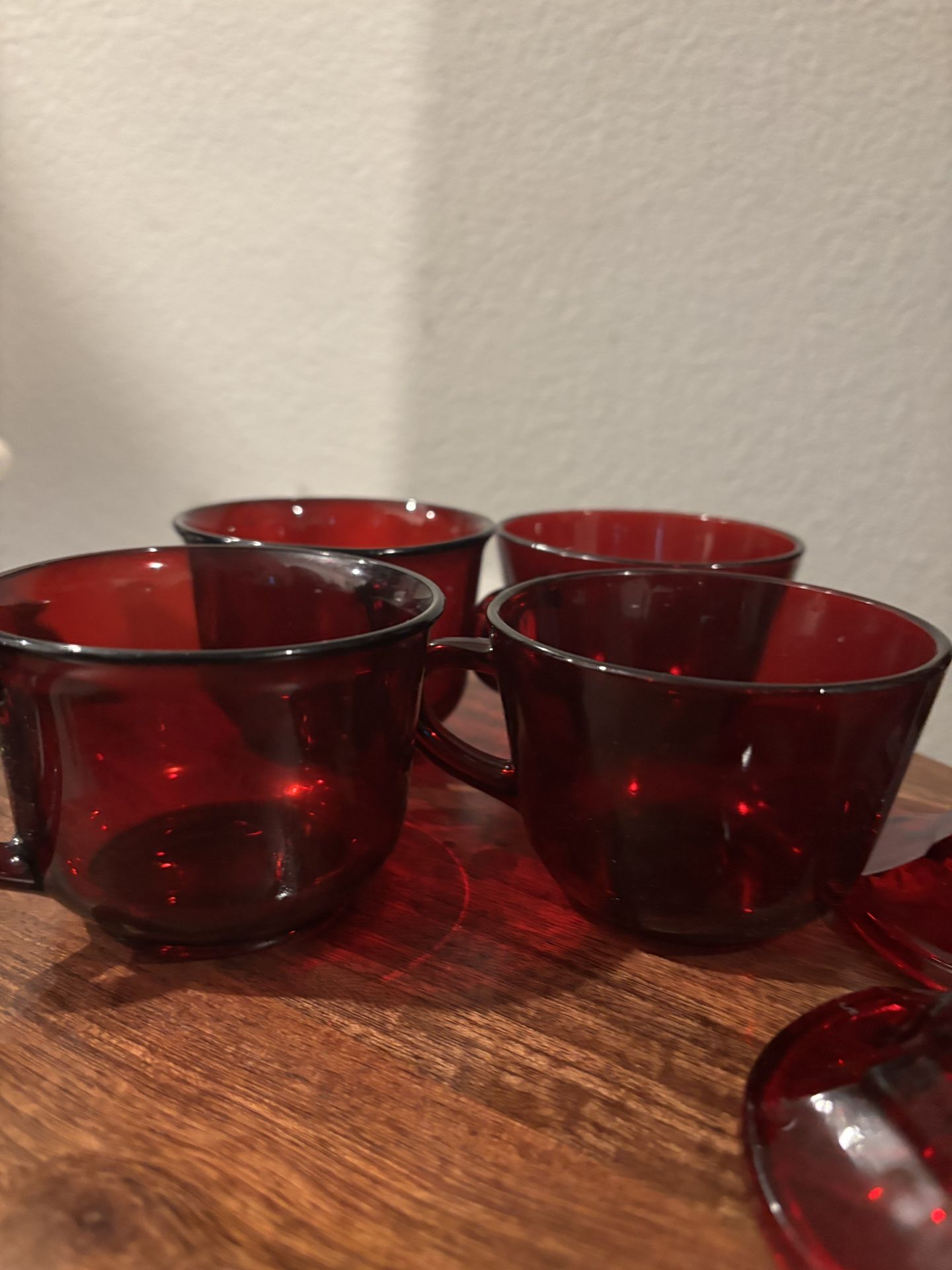 Four Vintage Royal Ruby Glass Coffee/Tea/Punch Cups - made in France This set has absolutely no chips, cracks, rough spots or flaws. Perfect for High Tea, wedding showers or for any occasion.