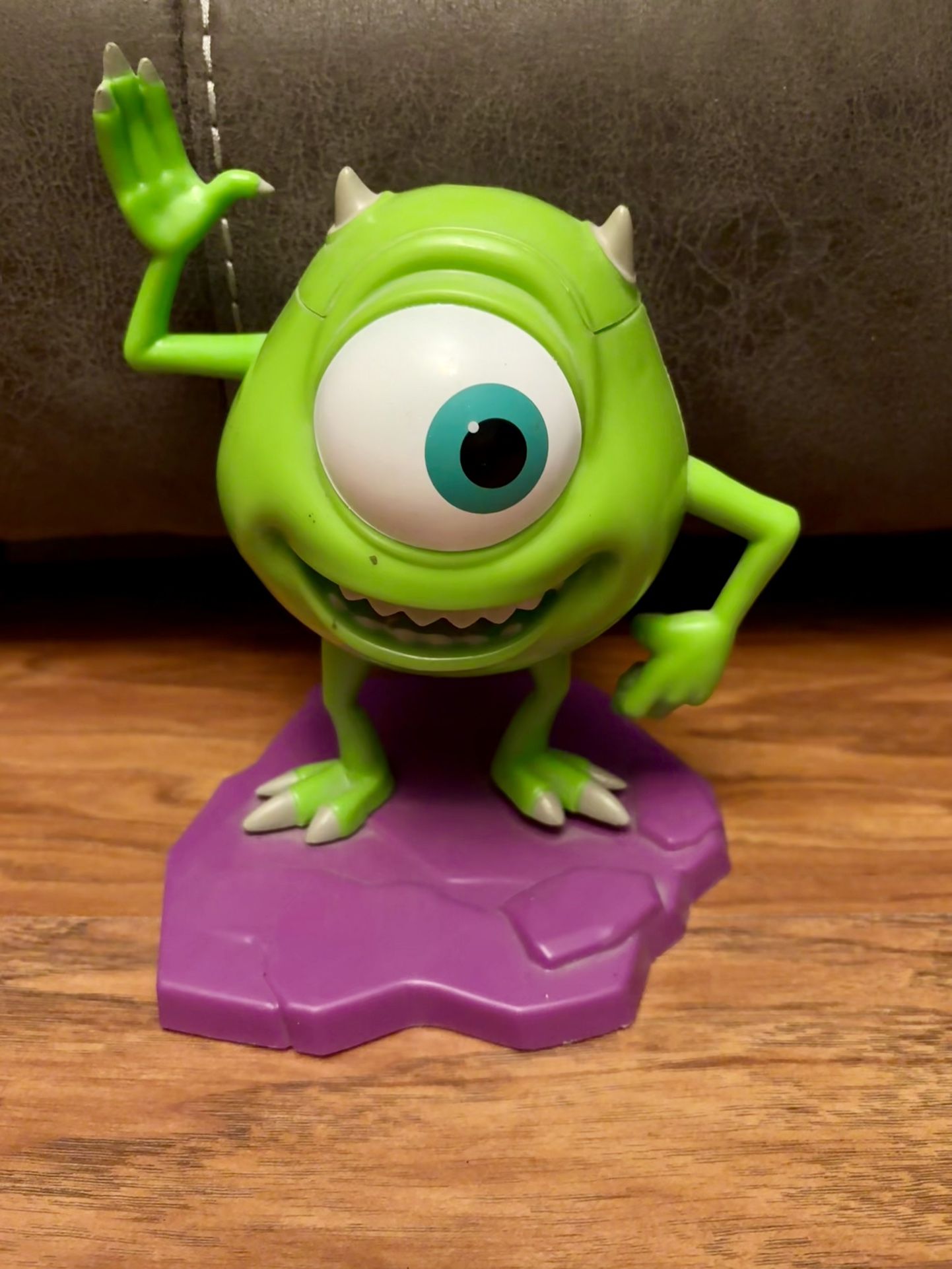 Add some monstrous charm to your collection with this Mike Wazowski figurine. This bright green, one-eyed wonder from Monsters, Inc. stands on a purple base, ready to bring a touch of magic to your shelf. Despite being used, Mike's vibrant colors and signature pose are sure to bring a smile to your face. Don't miss out on the chance to own this iconic character! Great for using it as a cup or for snoring snacks