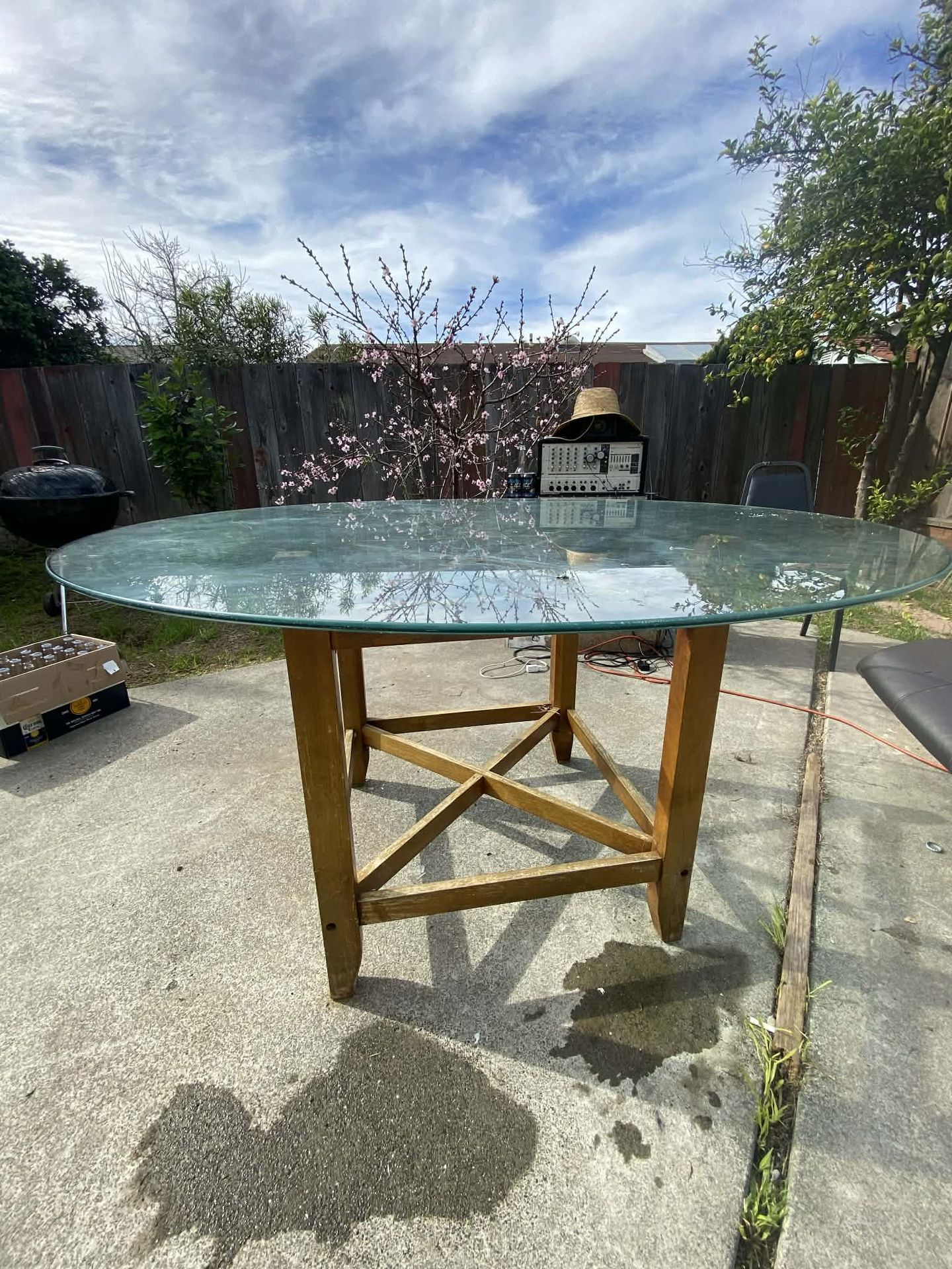 Used round table. Good for dining area, outside party table, etc. Glass top and wooden table feet. *glass top is a bit heavy * comes in 2 pc , you can take off the glass top
