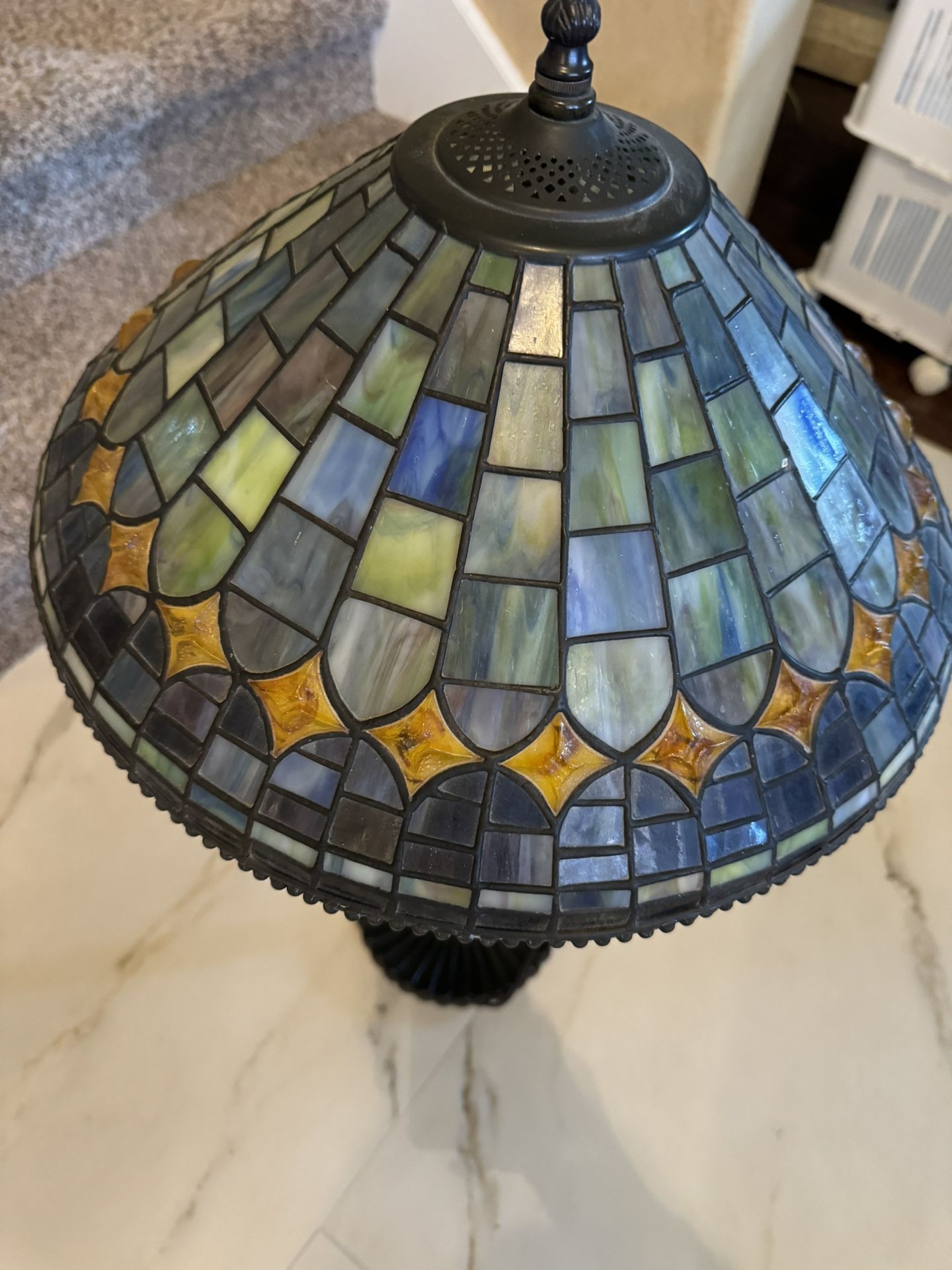 Beautiful tiffany style metal snd cut glass lamp with pull strings and dual lighting ir selected light level! Like new and barely used Only decorative in living room and office Excellent gift