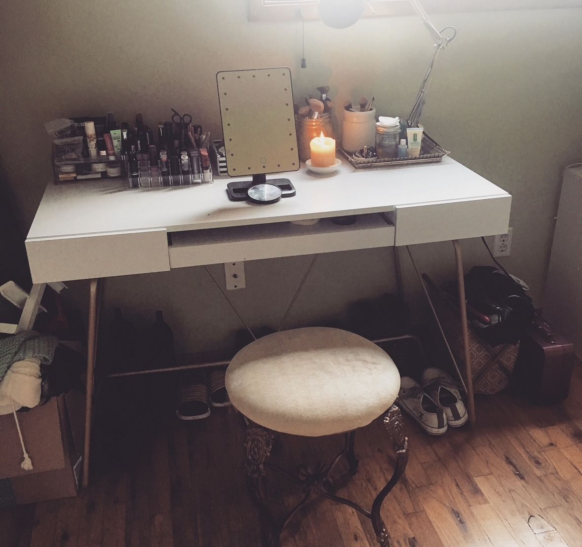 Moving out of state and can’t take this with me. I’ve used it as a working desk & a vanity, multi use! The first pic is the original desk without the marble contact paper. The legs come off and are spray painted gold. Needs a good refreshing but otherwise well loved and sad to see it go! Must pick up.