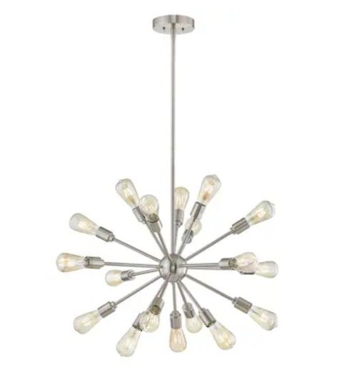 New, in original unopened box - 18-Light Brushed Nickel Mid-century Chandelier Brushed nickel finish chandelier features an artistic starburst design Adjustable downrod allows you to customize the hanging height 18 5-Watt ST19 vintage style LED bulbs included 35.43-In W x 77.2-in H Great for transitional style decor Mounting hardware included Dimmable feature allows you to adjust the brightness level to suit the mood ETL listing demonstrates this product has met minimum requirements of widely accepted product safety standards Change bulbs (sold separately) for a different look
