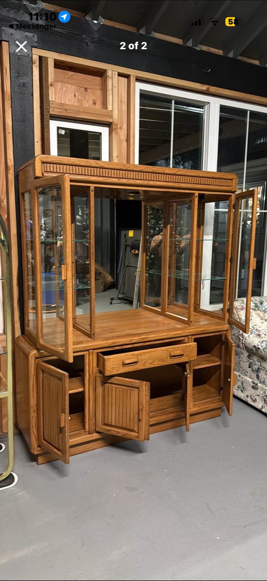 Beautiful solid oak china cabinet with upper glass display and lower storage. The top section features glass doors, glass shelves, and interior lighting—perfect for displaying collectibles, dishes, or décor. The bottom section offers cabinet storage and two center drawers. Excellent condition for its age; doors open and close smoothly.