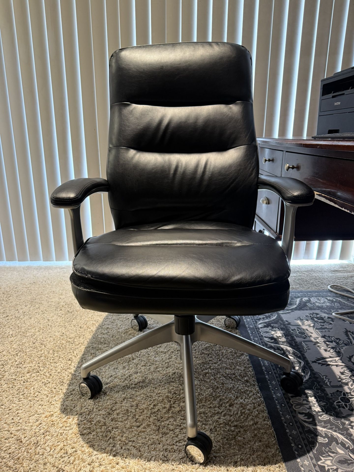 Bought new for $289. 1 year old, non smoking household, no pets. Enjoy all day comfort and premium lumbar support with this high back leather office chair. Our advanced memory foam layering system offers hours of lasting comfort and support while working or gaming. Premium pocketed coil technology offers advanced spring support for ergonomic seated comfort. Cool gel memory foam conforms to you while offering additional cooling, while fiber layers help to dissipate heat and promote airflow. A supportive headrest on this chair works with the mid-back lumbar contouring and layered body pillows to encourage better posture while sitting. From its expert craftsmanship and innovative design to its superior style, this modern office chair offers both an exceptional chair and an ergonomic sitting experience.