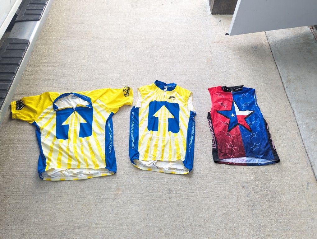 Bicycle Jersey 3XL XL M $20 EACH Like new perfect for ms150 charity bike ride Far left is a 3XL I have a short sleeve and a no sleeve in this shirt. Middle is XL Right is Medium That's all I have are these four shirts. Just in time for the ms150 bike ride Be sure to take a look at all of my other items for sale. Pick up in Deer Park Texas 77536