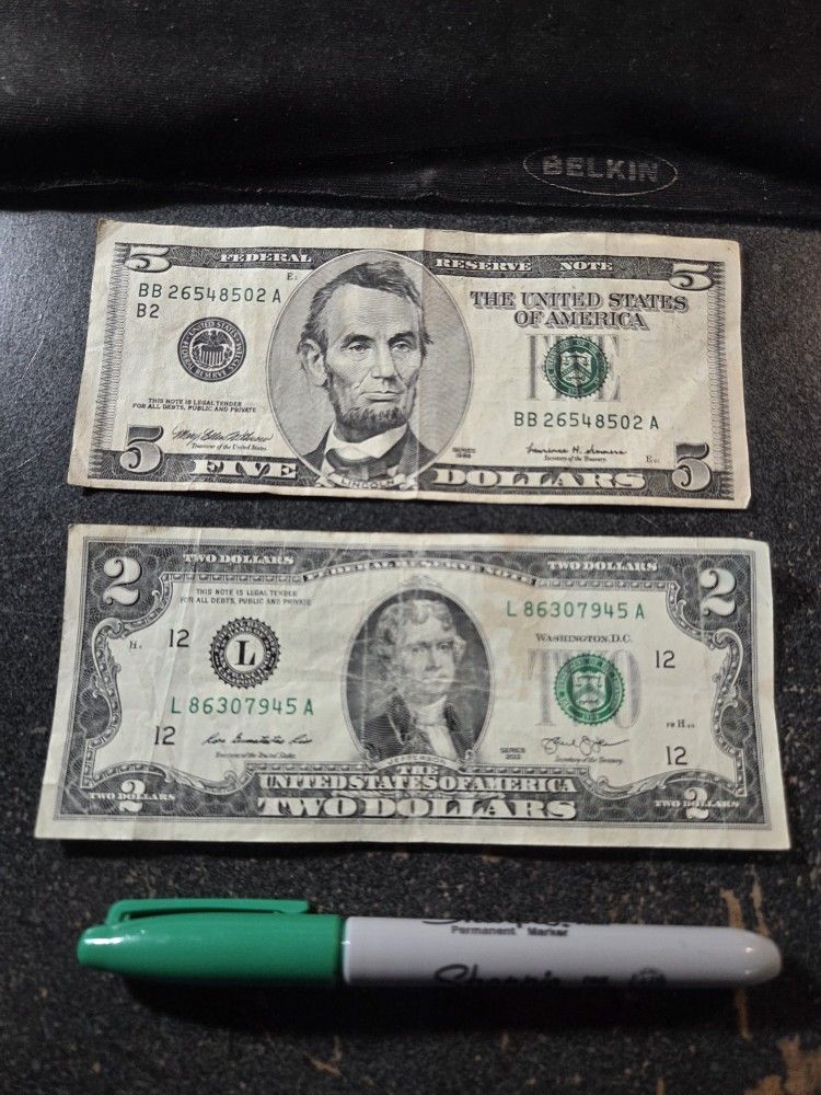 1999 $5 Bill Off Center, & $2 Bill With A Broken Ladder Serial Number 3(contact info removed) Collectible