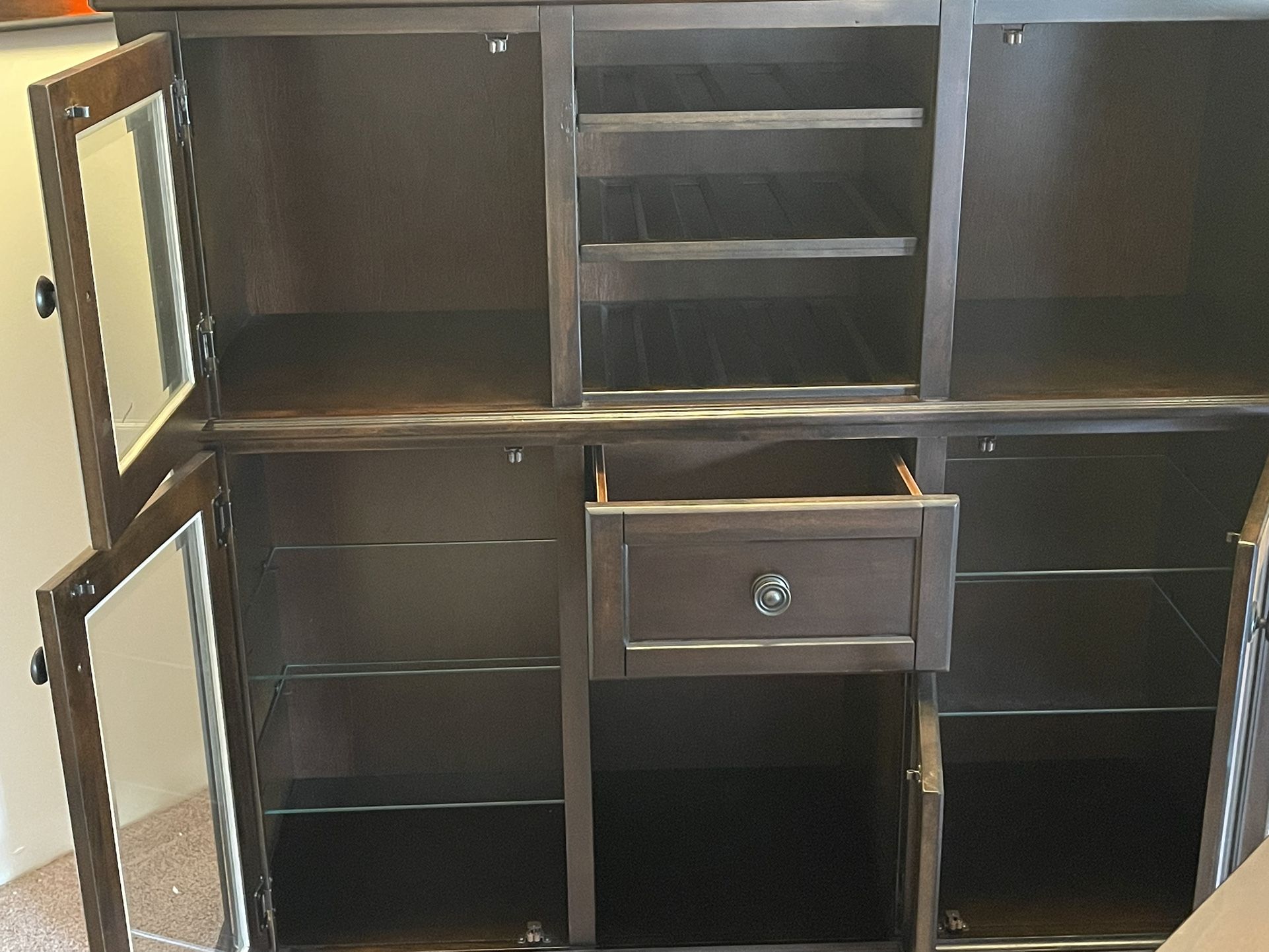Ashley Millennium Porter Dining Server for sale. Bun feet, 1 smooth operating drawer, glass shelves, wine shelves, 5 storage compartments (4 with glass inlays, 1 with wood inlay.) Solid wooden server. Perfect for your decor.