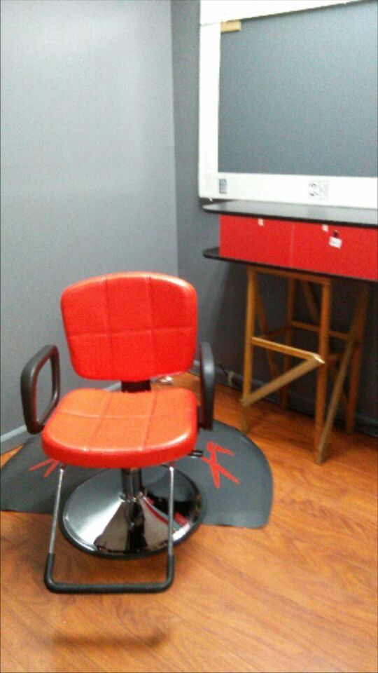 New Red stylist chair red and black station, black mat with red scissors stylist cape and Equipment holder 1 sets available $400.00 in box serious inquiries only