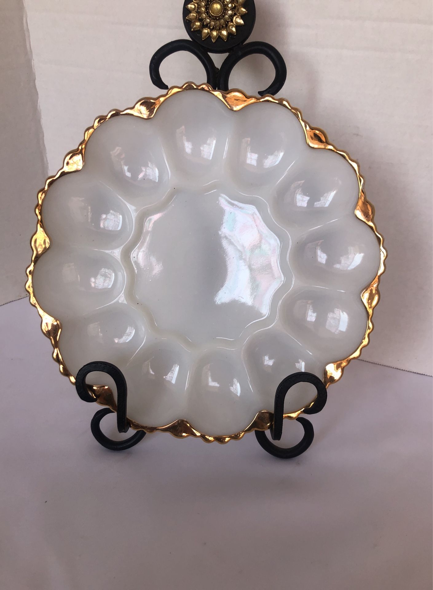 ANCHOR HOCKING MILK GLASS WITH GOLD ACCENT DEVILED EGG PLATE
