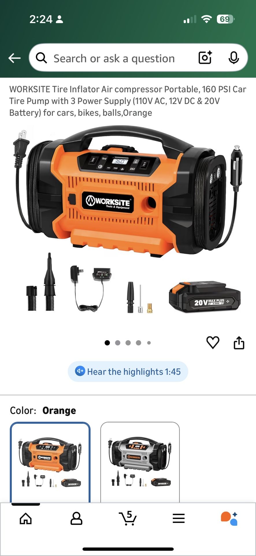 New Retail price $59.99 Pick up Otay Mesa Great for emergency when traveling or road trip. Fast Inflation:this tire compressor as it can inflate a 195/60 R14 no gas tire in 3 mins and a 215/60 R16 no gas tire in 5 mins to 36 PSI. Cool down the machine 3 minutes after 10 minutes of continuous use to protect the motor from overheating and burning out Multipurpose & Portable: This compact tire inflator works with cars, motorcycles, bicycles, sports balls, and inflatable pool toys. Note: Not suitable for large vehicle tires (e.g., pickups, light/heavy trucks) exceeding 245mm in width or 50PSI in pressure High Pressure Or High Flow Mode: You can easily switch between these two modes with one button. High pressure mode is for inflating car/bike/motorcycle tires, sport balls, inflatable pool toys and more. The high flow mode is for inflating or deflating air rafts, air mattress, floats and other low pressure but high flow items Triple Power Supply: Unlike those tire inflators with only 12V DC power, WORKSITE tire inflator comes with three different power options of 110V AC, 12V DC and a 20V battery. An easier and more convenient way to inflate all tires and inflatables at home and outdoors Automatic Stop & Two Bright LED Lights: Preset the value you want and the tire pump can automatically stop when the preset value is reached, making it safer to use. Two bright led lights make it easy to use when visibility is low and help you prepare for emergencies